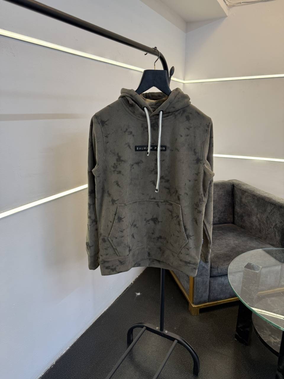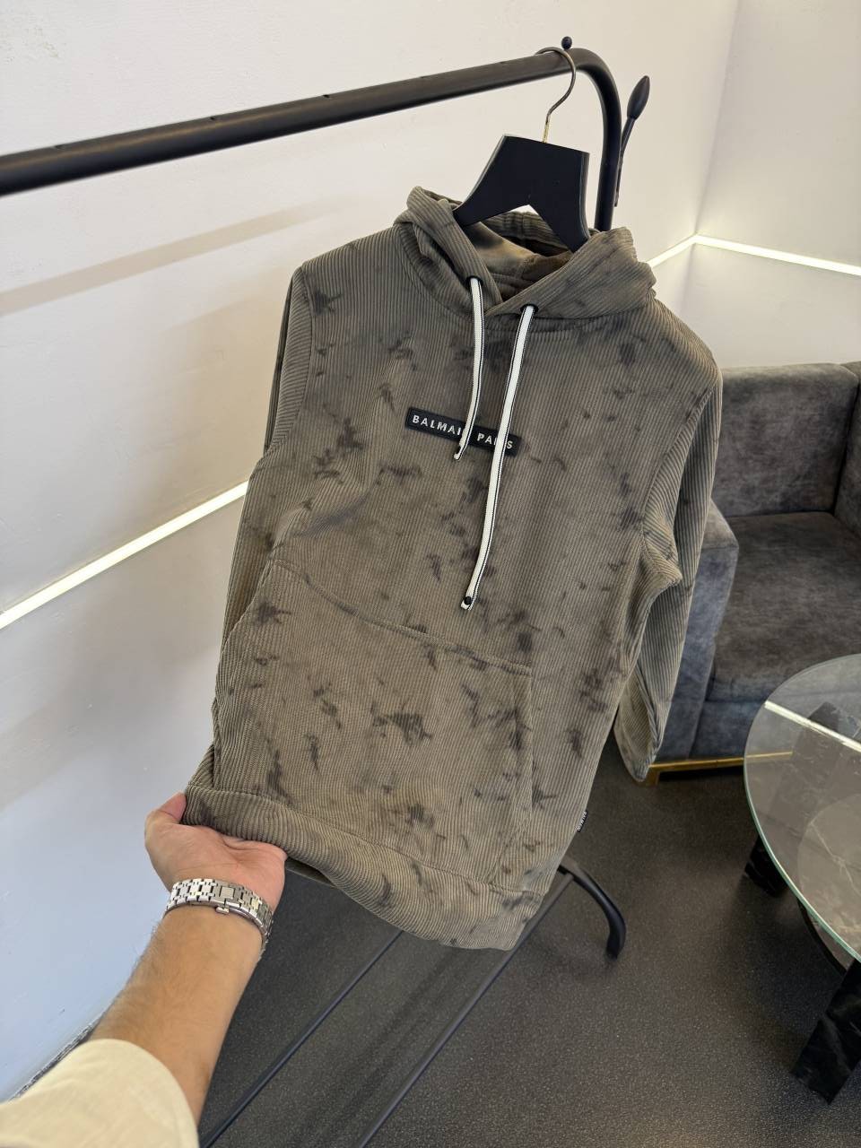 ? *Balmain imported washing cloudy look textured knitted fabric soft feel hoodie with balmain imported pu metal badge on chest front now in stock*?